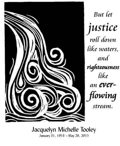 Jacquelyn Michelle Tooley, 62, died on May 26, 2015 at home in Berea, Kentucky, surrounded by friends, after a two-year struggle with melanoma. She pursued her passion for promoting peace and social justice through teaching and activism until her death.