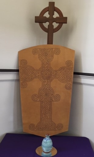 The design, hand-drawn on leather with precision markers, is copied from Union Church’s red Celtic cross banner and contains 81 “Do not fear” passages. — Debbonnaire Kovacs