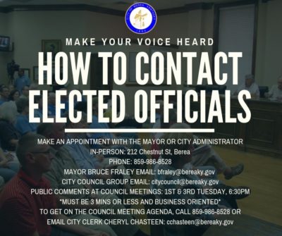 An opportunity to participate in our Berea city government You are invited to attend the Berea City Council meeting this Tuesday, August 20, at 6:30 p.m. in the Council Chambers. Public comment will be received beginning at 6:30 regarding a proposed Order revising the current policy & procedure of offering invocations – which had invited prayers by volunteers from many faith traditions before City Council Meetings – and establishing the office of Chaplain, with a compensation to be paid by the City, and to be filled by Rev. Kevin Slemp, who will lead the prayers at each meeting. In the event he is unable, a member of City Council will lead the prayer, who will also be compensated. If you’d like to offer your views on this proposed change you can send a group email: citycouncil@bereaky.gov OR contact City Council members individually:
