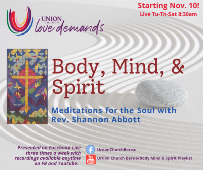 Take time for prayer with our new meditation series. Three times a week the Rev. Shannon Abbott, colleague of Rev. Kent and gifted prayer leader guides 10-20 minute meditations just right for taking a break. Join us Tuesday, Thursday’s and Saturdays for new offerings!