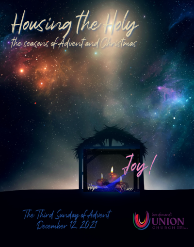 This third Sunday in Advent we are focusing on JOY. The Justice Candle is being lit in honor of The Christmas Basket Program and the joy of providing food and toys to members of the community through the partnership between Union Church and St. Clare Catholic Church here in Berea. We also honor Dennis Jacobs, member of St. Clare who has spearheaded this program which, began many many years ago at St. Clare. Union Church joined that program in 2015. Early on, folks could sign up and shop for the actual food in the baskets, but this has been simplified through the assistance of Meijer, which will take the donations and purchase the food at much better costs than we can do so individually.