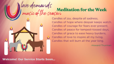 Welcome to worship this morning. On this first Sunday after Christmas Day we are still celebrating the presence of Christ and still immersing ourselves in the light of our Advent Wreaths. If you have yours close by, light yours with the one in the church. Today’s service is full of music and rejoicing. As the days of Christmas lead us toward a new year, we remember the words of the reformer, John Robinson: “There is yet more truth and light to break forth from God’s Holy Word.” We light these candles as a reminder that “Emmanuel”: God is with us.