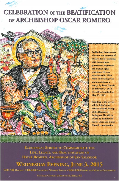 Celebration of Oscar Romero June 3 with St. Clare Catholic Church… Union Church and St. Clare members have maintained a 20+ year partnership with the community of Valle Verde in El Salvador. Dozens of Bereans have traveled to El Salvador as part of this partnership. Pope Francis recently beatified murdered Archbishop Oscar Romero, and our two churches will celebrate Romero’s contribution to justice and Christian faith. New Bishop of Lexington (RC) Stowe will preach.