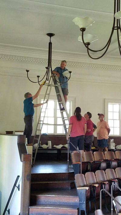 The new dimmable LED bulbs use approximately the same wattage, but provide almost double the lumens per bulb. Because LED’s have to be carefully matched to the dimmer switch that controls them, 5 fixtures at the rear of the sanctuary were selected as our test. These 5 are all on one switch and were the easiest to reach. The rest of the bulbs will be replaced in the coming weeks with all the chandelier glass cleaned and ready for another decade! Many thanks to our volunteers: Joseph Jacobs, Susan Doring Zook, Roger Cook, Howard Carlberg, Bryce Carlberg, Kelly Mehler, Bob Boyce and Karl Holland!