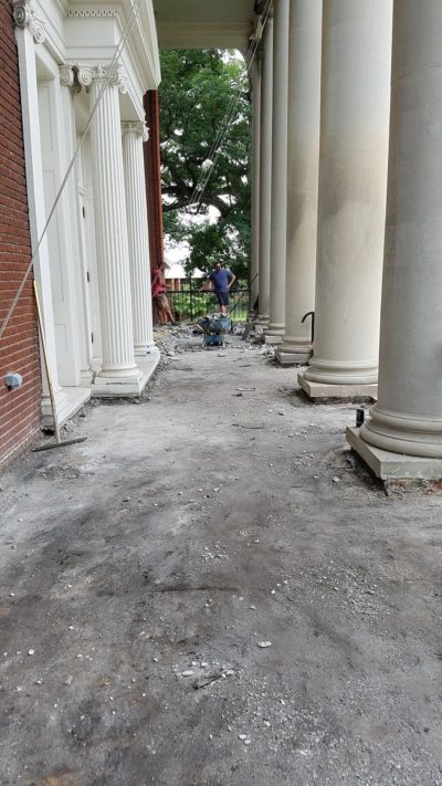 The project involved chiseling out the nearly 100 year old aggregate bed, as well as the thin acrylic sealing later that was applied 12 years ago. New concrete, colored and textured to complement the natural stone of the steps and pillars was then poured at a slight slope to better drain rainwater.