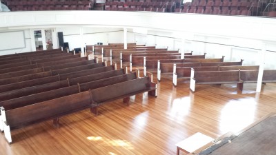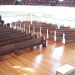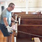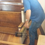 Work progressed swiftly this week after a weekend of letting the final floor coats dry. As of today (Tuesday) all of the pews have been relocated to their new positions, tightened, and been screwed together securely. The new angled side sections provides wider aisles and improved viewing angles. We’ve also left more room for wheelchairs and rocking chairs.
