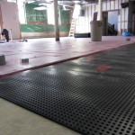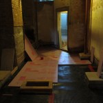 This week construction crews have been preparing the Community Room for it’s new floor. First pipes were placed in the drainage trenches in the floor. Next an impermeable layer of that channels water to the trenches was installed under 1″ of foam insulation. On top of all of that will be 2″ of new concrete making a smooth new surface for new tile. The concrete will be poured in two huge sections later this week. Stay tuned!