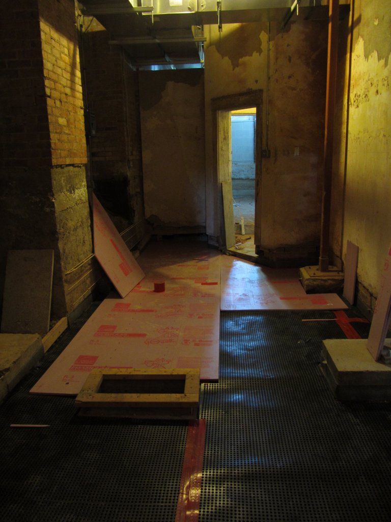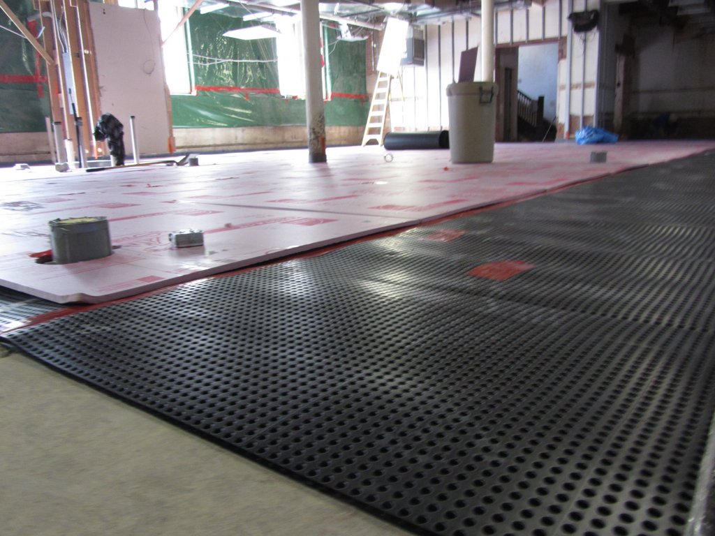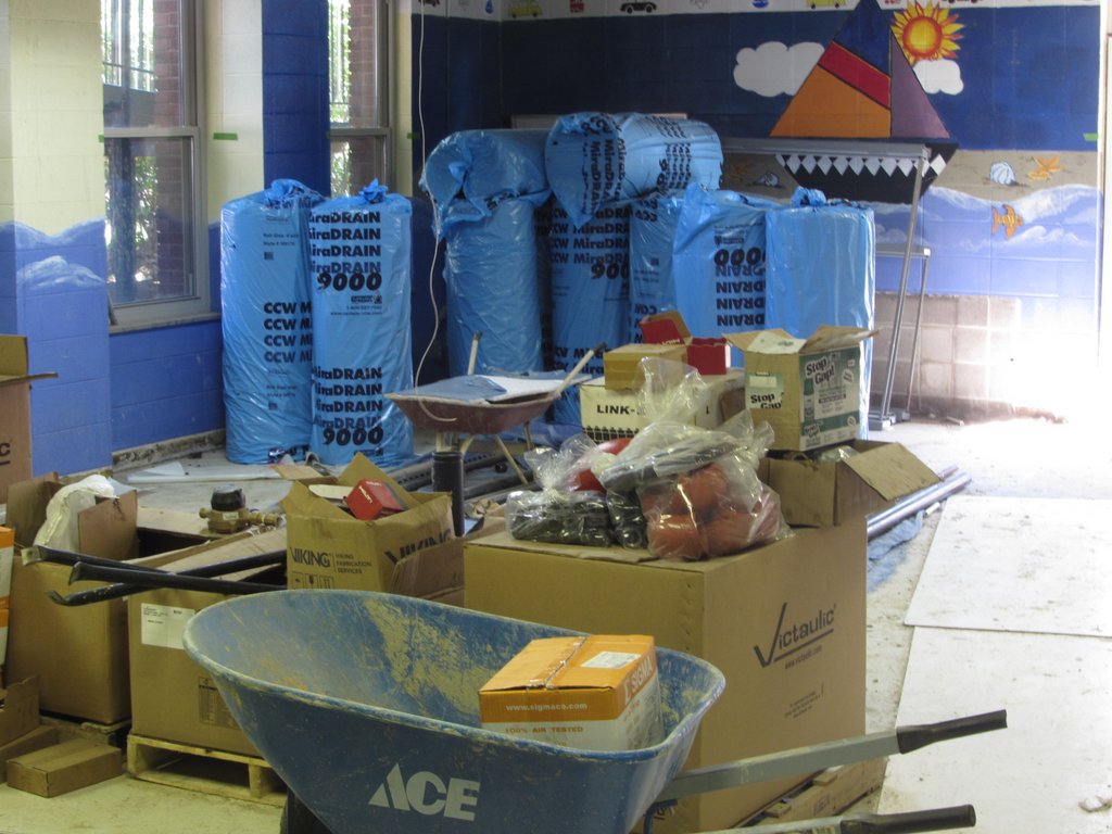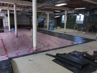 This week construction crews have been preparing the Community Room for it’s new floor. First pipes were placed in the drainage trenches in the floor. Next an impermeable layer of that channels water to the trenches was installed under 1″ of foam insulation. On top of all of that will be 2″ of new concrete making a smooth new surface for new tile. The concrete will be poured in two huge sections later this week. Stay tuned!